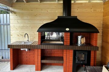 Мангал – это самый популярный элемент печного комплекса барбекю из кирпича, потому что предназначен для приготовления шашлыка и множества других вкусных блюд. Основание и стенки топки выполнены из красного керамического кирпича. Металлический дымосборник состоит из двух куполов: рабочего толщиной 1,5-2 мм и декоративного с покрытием эмалью. Дымоход выполнен из двустенного сэндвича с утеплением и закачивается оголовком-искрогасителем. Дополнительно возможно установить шибер для регулировки процесса горения. В топку встраивается мангальная вставка с металлом 3 мм, которая футерована шамотным кирпичом и имеет несколько уровней рамки для шампуров. Задняя стенка защищена нержавеющим фронтальным экраном-отражателем для избежания перегрева задней стенки топки. Таким образом, мангал можно топить не только углем, но и дровами.